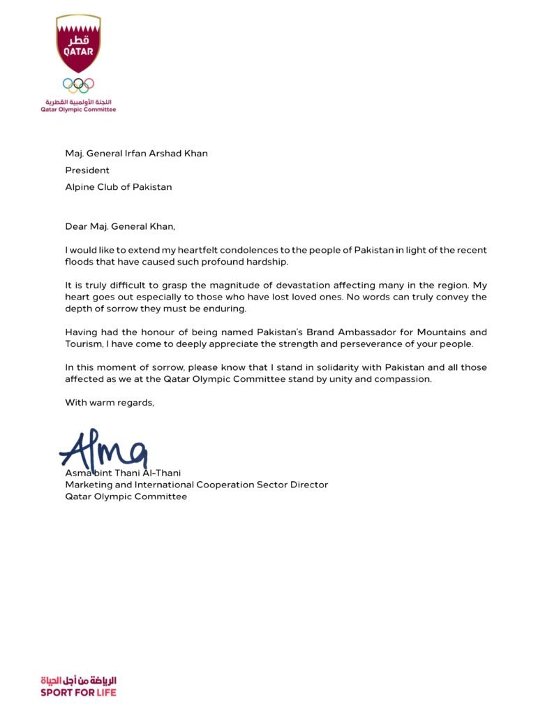 Islamabad, September 1, 2025 – The Alpine Club of Pakistan has received a touching letter of condolence from Ms. Asma bint Thani Al-Thani, Marketing and International Cooperation Sector Director at the Qatar Olympic Committee, in the wake of the devastating floods that have severely affected communities across Pakistan.
